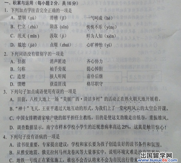 一次考试不是一次重大命运转折,只是一次对知识掌握程度的评测。为了能给大家第一时间内分享中考语文试题的相关信息,出国留学网会及时更新出所需要的信息资料,供2014年南宁中考考生们为复习做准备,请届时关注。(CTRL+D即可收藏)