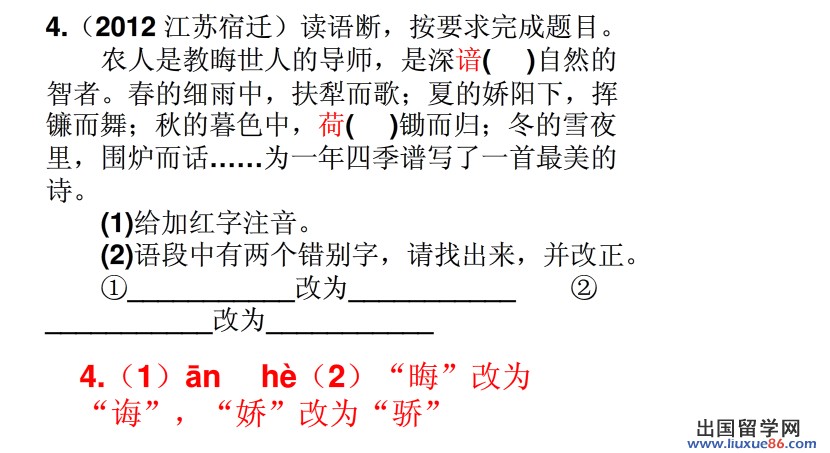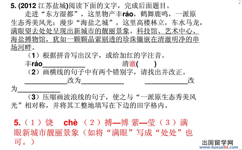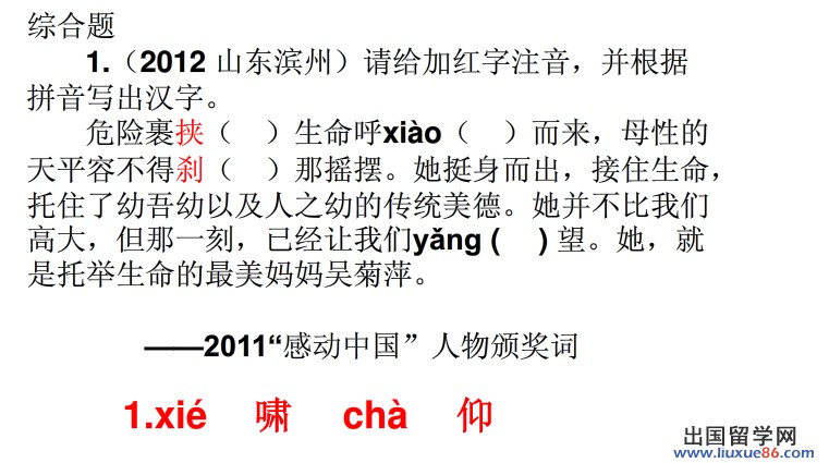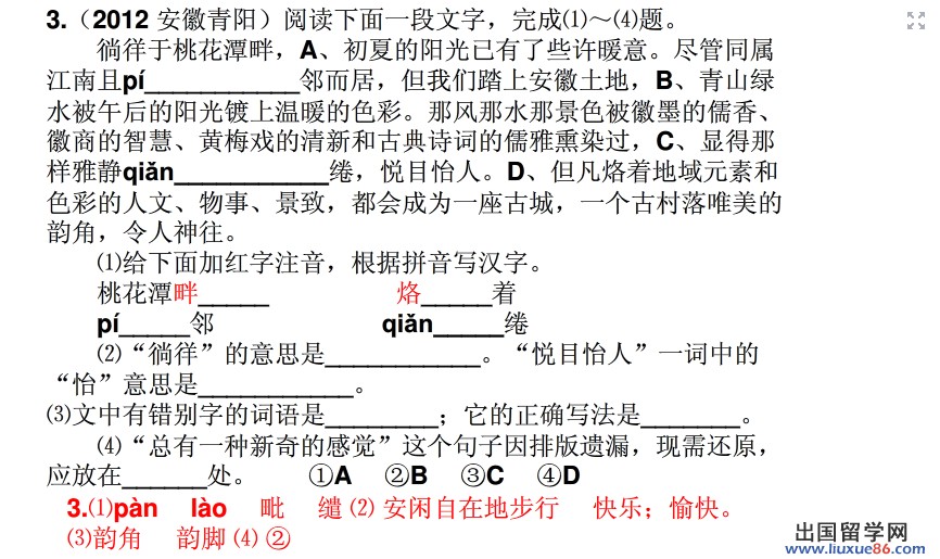 同学们复习中考语文汉字的正读与书写时,可根据《考试说明》中要求读写的汉字(或词语)为重点复习范围,着重四字短语,辅之以汉字书写习题进行训练。更多有关2014中考语文的信息可登录出国留学网语文频道,欢迎收藏本站(CTRL+D即可收藏)!