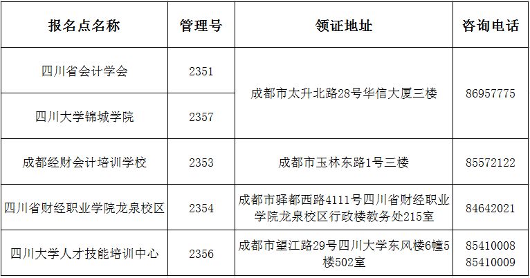 ★省直考区四川省会计学会报名点领证时间为工作日:上午9点-12点,下午14点-17点。