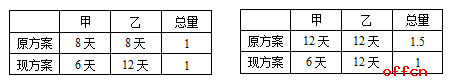 通过比较原方案与现方案的差异能够得出,当乙的工作都为12天时,可得甲单独干6天能完成总量的一半,所以甲单独完成工作总量需要12天。