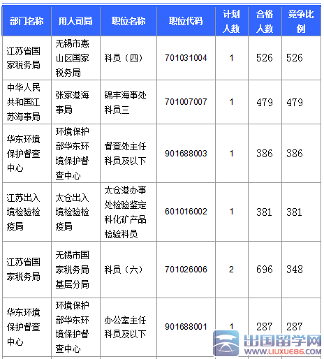 为帮助广大考生更清晰的了解今日报名情况,出国留学网整理了江苏省审核通过人数前五位的部门以及竞争比例最激烈的五大部门,供广大考生参考: