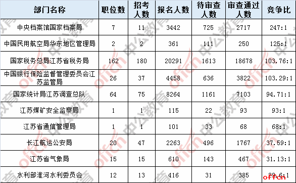 截止到31日9时,通过审核人数前三位的部门依次是:国家税务局江苏省税务局、国家统计局江苏调查总队、中国银行保险监督管理委员会江苏监管局,三部门通过审核总人数为29603人,占通过审核总人数的77%。