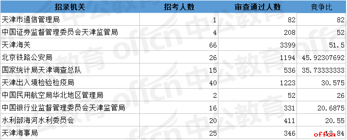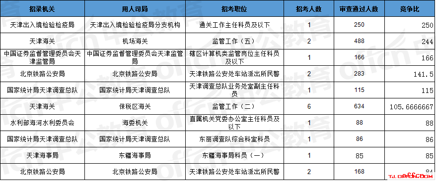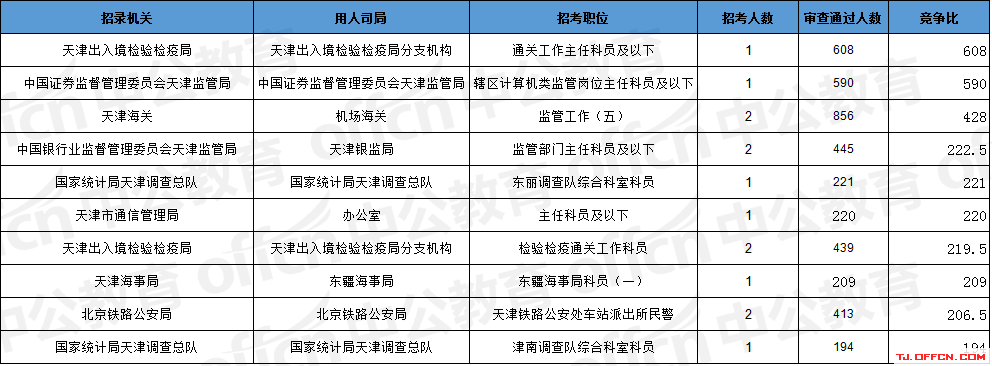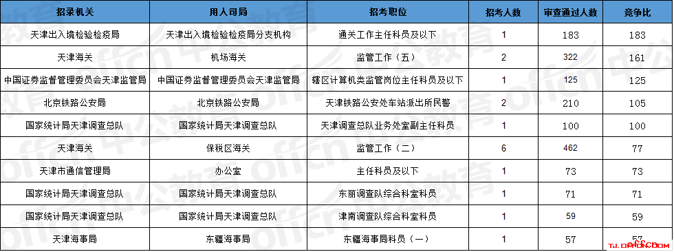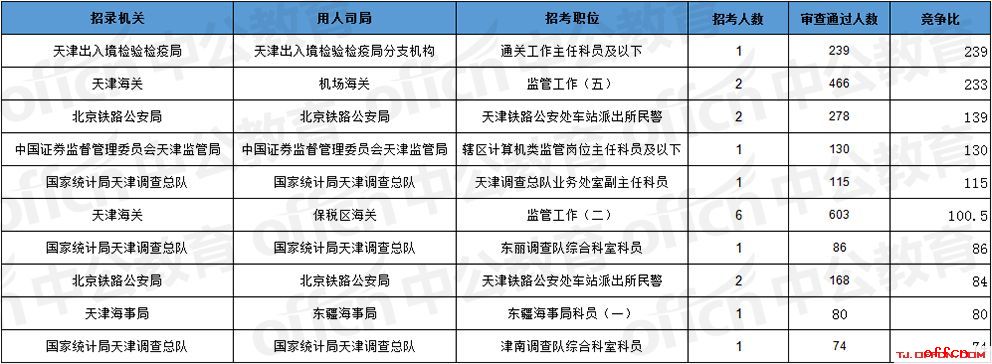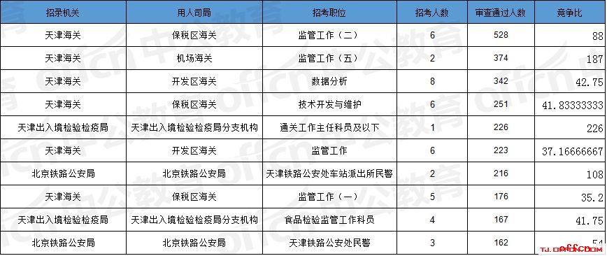 报名通过审核人数前十的职位主要集中在天津海关、北京铁路公安局、天津出入境检验检疫局等部门,具体信息如下: