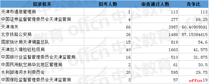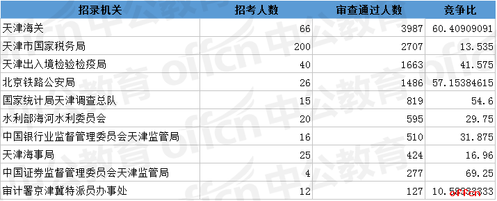 截止到5日16时,通过审核人数前三位的部门依次是:天津海关、天津市国家税务局、北京铁路公安局,三部门通过审核总人数达5457人。