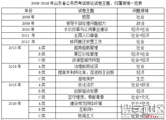 不论是国家公务员考试还是各省市的公务员考试,都要求材料主题贴近社会生活。从上表可以看出,山东省公务员考试偏重于对社会和经济领域的考查。近年来,山东申论以复合领域主题考查的特点越来越突出,2016 年山东A 类、C类试卷主题涉及的都是“社会+政治”领域,而往年的山东申论考试也不乏对经济、文化和生态领域的考查。为此,考生要提高对当前五大领域问题的认知力,全面备考。
