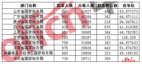 2017国家公务员考试报名阶段已于24日18时落下帷幕,截止24日17时30分,共计1338698人通过审核,竞争比49.5:1,仍有 223个职位无人报考。从国家公务员考试网统计出来的数据可以看到,2017国考报名最多的十大部门全部来自国税系统,山东国税局以42027人通过审核位列第一,广东国税局、贵州国税局分别以40384、38579人位列第二、第三位,这十大部门总共报考353727人,占总报名人数的26.4%。