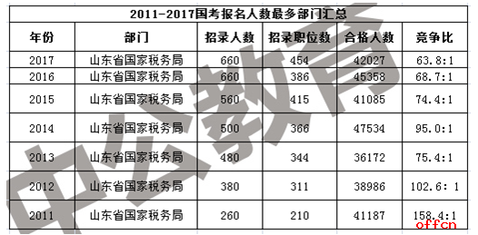 从2011国考至今的报考情况来看,山东国税局一直问鼎国考,连续7年夺得国家公务员考试报考人数最多的部门,首先这与其招考人数较多有一定关系,同时山东的地理环境优势以及接受的教育都有一定关系。