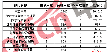 2017国考竞争最激烈部门毫无悬念由民盟中央获得,该部门仅招录6人,合格人数已经12245:1,竞争比达2040:1,这也是因为最高报考职位出自民盟中央,以此拉高了整体竞争比例,除此以外,储备物资管理局也是考生竞争的部门,竞争最激烈的十大部门中,就有六个来自此系统,最高竞争比达 687.5:1。