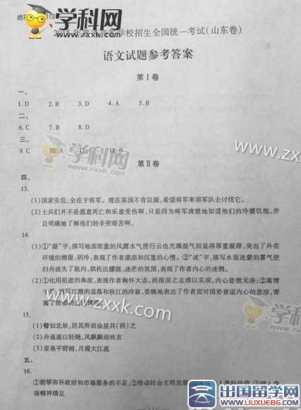 小编在此提醒各位,考试时如果遇到不会的题目千万不要慌张,要沉着应对,跳过去或者做自己会做的题,高考,如果你能把自己会做的题全部做对,成绩也不会太差。另外我们出国留学网高考频道会及时为广大考生提供2015年山东高考语文真题及答案,同时接下来的几个科目真题及答案亦会在此频道显示,请考试及家长关注本站更新(ctrl+D收藏即可)。一旦2015山东高考真题及答案发布,将在此表页的头条显示,如果您需要查找的真题及答案没有显示,请按ctrl+F5进行刷新。