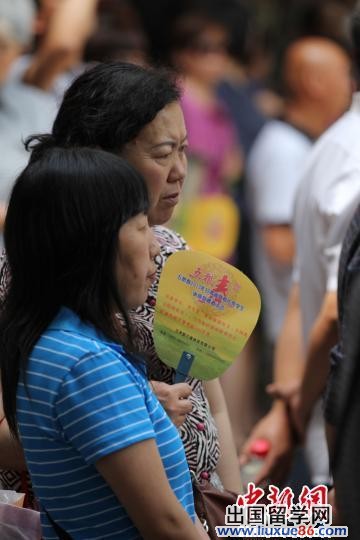 白酒广告印在扇子上,给等待考生的家长带来一丝清凉。闫雅琪摄