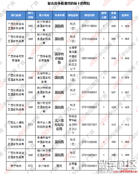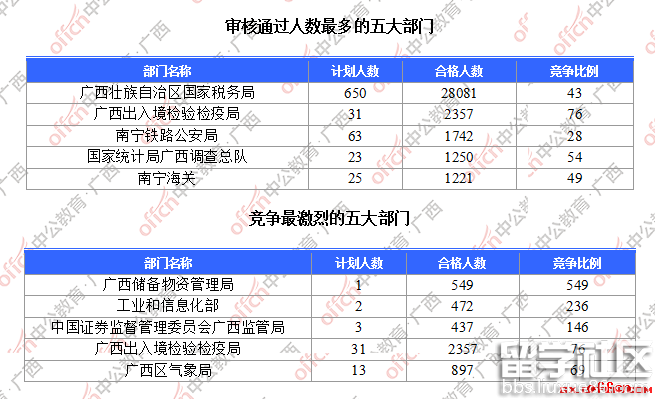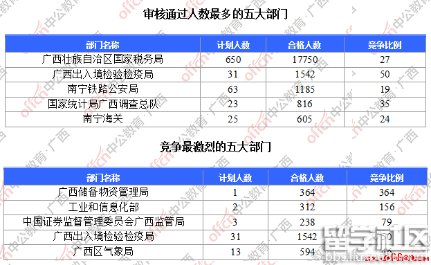为帮助广大考生更清晰的了解今日报名情况,广西中公教育整理了审核通过人数前五位的部门以及竞争比例最激烈的五大部门,供广大考生参考: