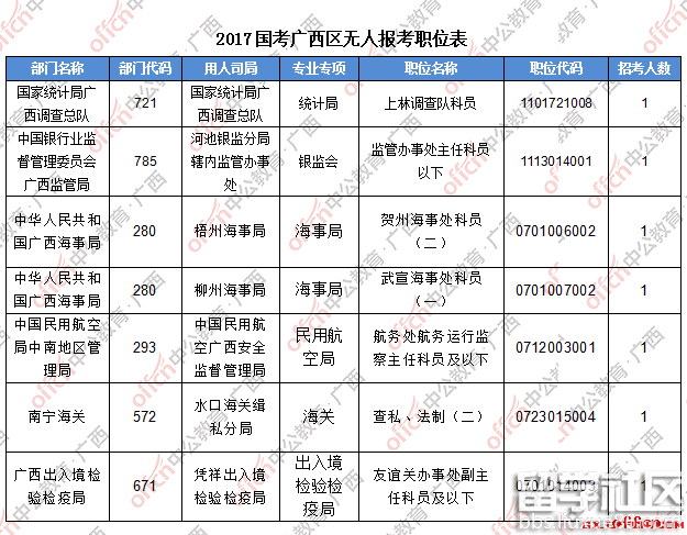 截止到22日16时,工作地点在广西的职位共有7个无人报考,仅占全部职位的1%。下面是部分广西无人报考职位一览表,广西中公教育专家建议广大考生结合自身条件,根据自己的实际情况找到属于自己的最佳职位,避免激烈竞争。