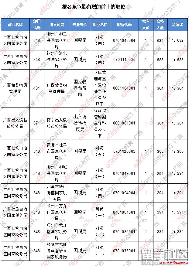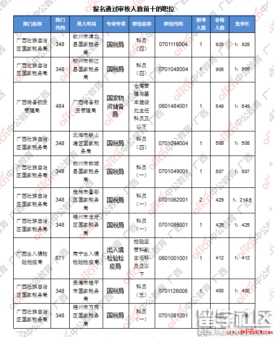 报名通过审核人数前十的职位主要集中在广西壮族自治区国家税务局、广西储备物资管理局、广西出入境检验检疫局等部门,具体信息如下: