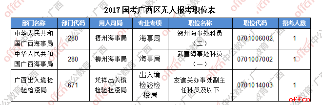 截止到24日17:30分,工作地点在广西的职位共有3个无人报考,仅占全部职位的0.46%。下面是部分广西无人报考职位一览表。