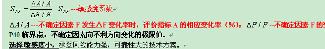 P41选择方案:如果进行敏感性分析的目的是对不同的技术方案进行选择, 一般应选择敏感程度小、承受风险能力强、可靠性大的技术方案。(P40图中:斜率越大敏感度越高)