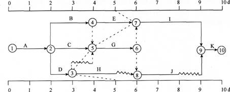 94、某工程双代号时标网络计划,在第5天末进行检查得到的实际进度前锋线如下图所示,正确的有( )。