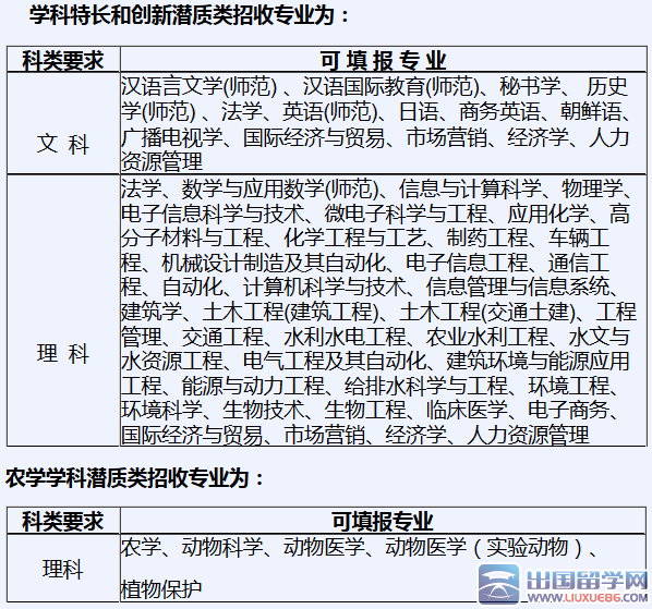 凡符合学科特长和创新潜质类条件之一的,可在学科特长和创新潜质类或农学学科潜质类中任选一类报名,符合农学学科潜质类条件的只能在该类报名。