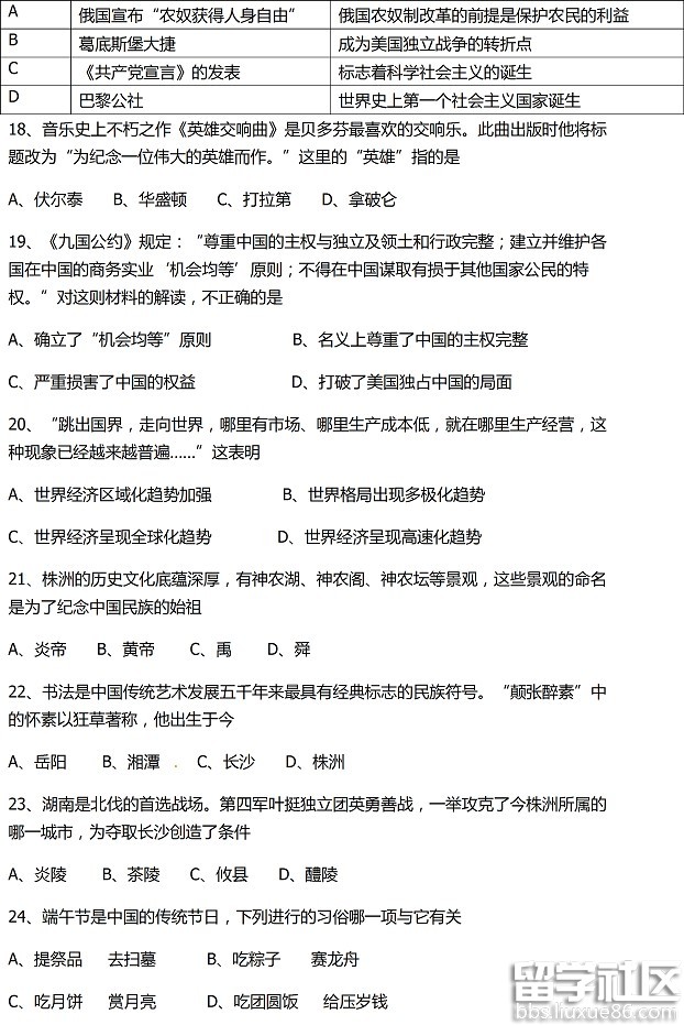 九年卧薪尝胆,六月一马冲关。出国留学网中考频道第一时间为您公布2016年株洲中考历史真题及答案,希望对您有所帮助,欢迎您访问出国留学网浏览更多中考资讯,了解最新信息请按CTRL F5刷新页面。更多株洲中考分数线、株洲中考成绩查询、株洲中考志愿填报、株洲中考录取查询信息等信息请关注我们网站的更新!