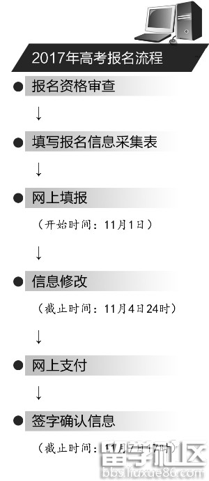 1.全省高考网上报名时间为2016年11月1日至4日,逾期不予补报。不符合2017年普通高考报考科类所规定的必修科目测试等级要求的考生,在高考报名时还必须参加相关必修科目测试的报名。考生报名信息确认的截止日期为11月7日。