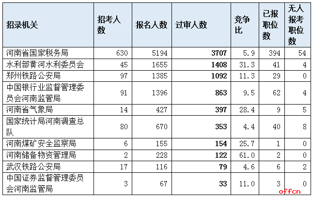 报名通过审核人数前十的职位主要集中在郑州铁路公安局、河南省气象局、水利部黄河水利委员会等部门,具体信息如下: