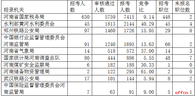 截止到11月8日18时,通过审核人数前三位的部门依次是:河南省国家税务局、水利部黄河水利委员会、郑州铁路公安局,三部门通过审核总人数达31575人,占通过审核总人数的75.24%。