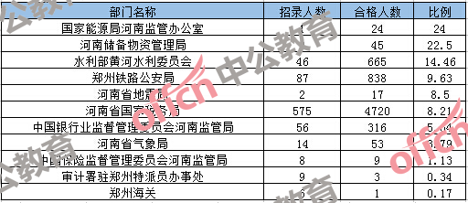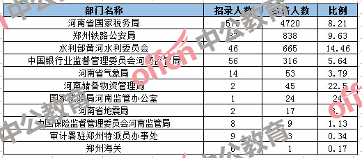 截止21日17时,通过审核人数前五位的部门依次是:河南省国家税务局、水利部黄河水利委员会、中国银行业监督管理委员会河南监管局、郑州铁路公安局和河南省邮政管理局,五部门通过审核总人数15144人,约占通过审核总人数的95%。竞争最激烈的部门为河南省邮政管理局,该部门共招录5人,目前通过审核人数为1017人,竞争比127.1:1。