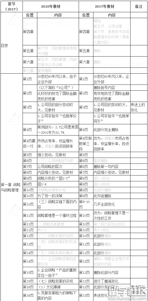 2017年注册会计师考试报名4月5日起,2017年注册会计师考试大纲已经公布,注会考试教材也已上市,为了帮助各位学员更有针对性地进行2017年注会备考,尽快熟悉及了解新教材内容调整变动情况,以下是2017年注册会计师考试《公司战略与风险管理》新旧教材总体变化情况。