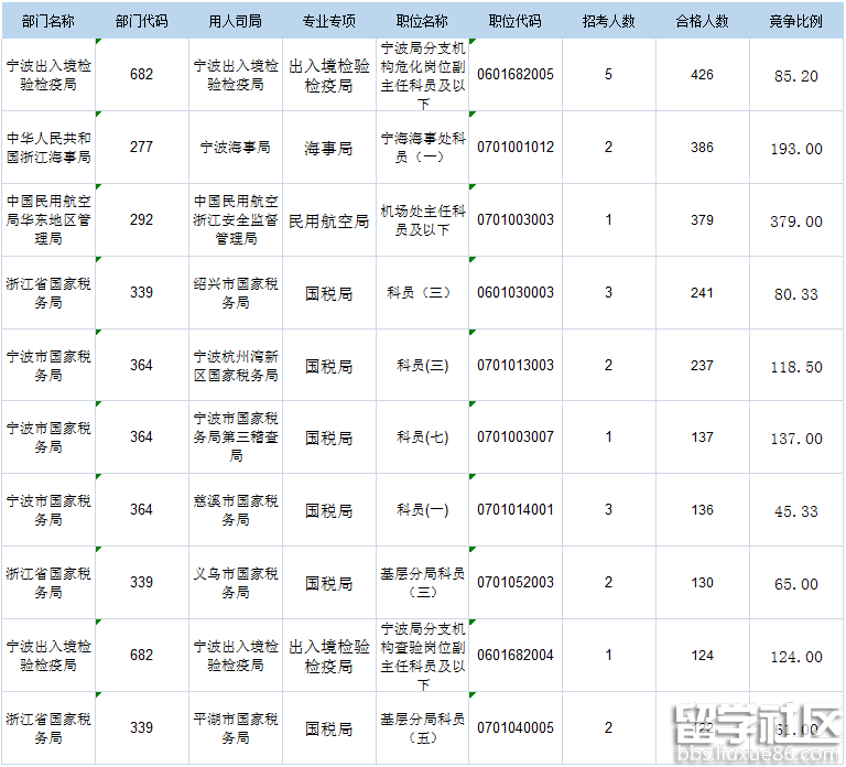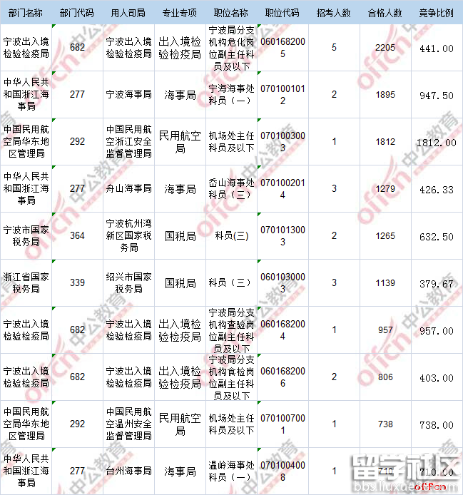 报名通过审核人数前十的职位主要集中在中国民用航空局华东地区管理局、宁波市国家税务局、中华人民共和国浙江海事局等部门,具体信息如下: