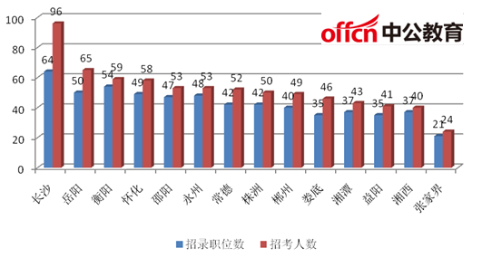 岳阳、衡阳、怀化等12个地区的招录人差不多,都在40人到65人之间。