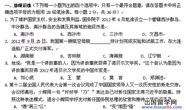 一次考试不是一次重大命运转折,只是一次对知识掌握程度的评测。为了能给大家第一时间内分享中考政治试题的相关信息,出国留学网会及时更新出所需要的信息资料,供2014年湘潭中考考生们为复习做准备,请届时关注。(CTRL+D即可收藏)