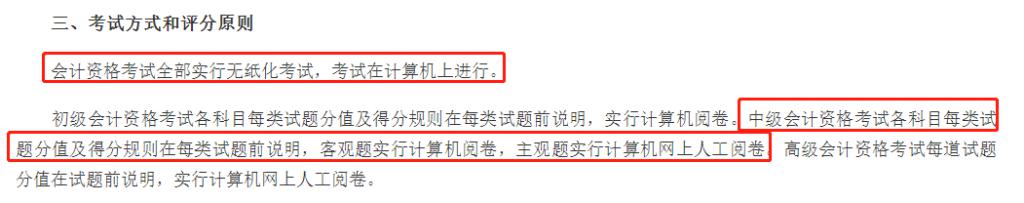 通知中还强调,中级会计资格考试各科目每类试题分值及得分规则在每类试题前说明,客观题实行计算机阅卷,主观题实行计算机网上人工阅卷。