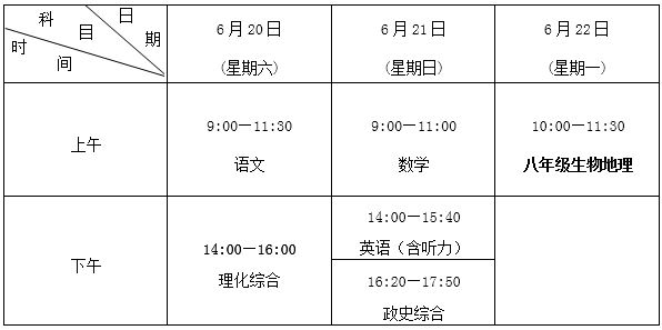 考试时间:考试科目的考试时间为6月20日至21日。各科考试时限为:语文150分钟、数学和理化综合各120分钟,英语(含听力)100分钟,政史综合90分钟。各场具体考试时间安排如下: