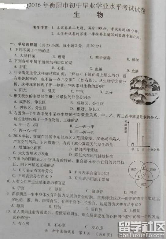 十年寒窗磨利剑,六月沙场试锋芒。出国留学网中考频道第一时间为您公布2017衡阳中考生物试题及答案,希望对您有所帮助,欢迎您访问出国留学网查看更多中考资讯,了解最新信息请按CTRL F5刷新页面。更多衡阳中考分数线、衡阳中考成绩查询、衡阳中考志愿填报、衡阳中考录取查询信息等信息请关注我们网站的更新!