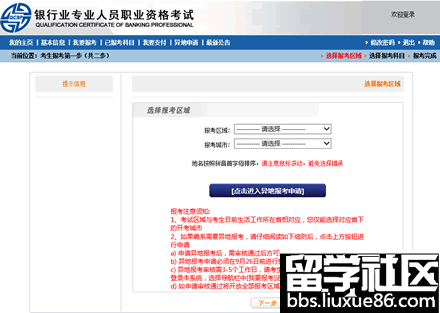 第一步:考生在线报名时,进行到“选择报考区域”步骤中,点击“点击进入异地报考申请”按钮。