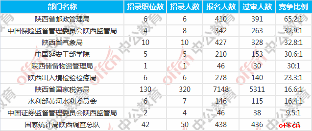 截至到8日18时,通过审核人数前三位的部门依次是:陕西省国家税务局、西安铁路公安局、中国银行业监督管理委员会陕西监管局,三部门通过审核总人数达29938人,占通过审核总人数的79.6%。