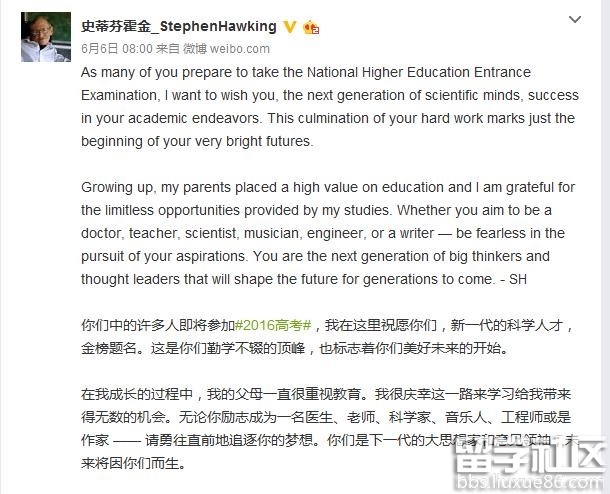 霍金在微博中为考生送上祝福