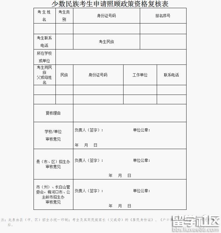 吉林2017高考少数民族考生申请照顾资格复核表