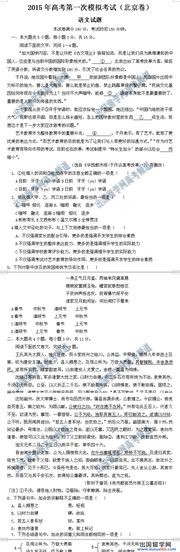 以下是出国留学网高考频道为您精心提供的2015年北京高考语文第一次模拟考试试题,希望对大家的2015高考复习有一定的帮助。(注:下方有word版下载地址)